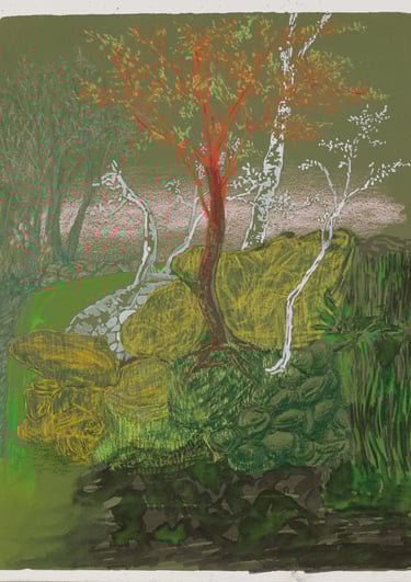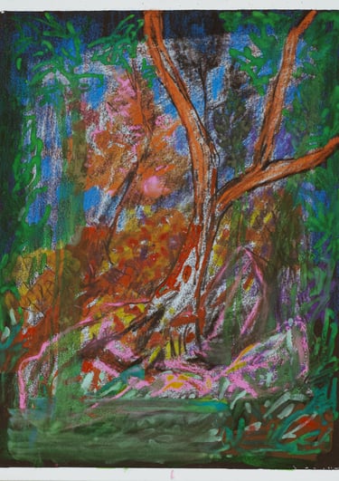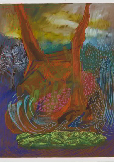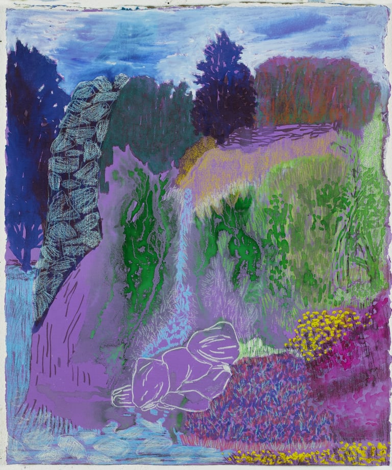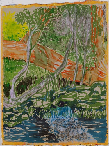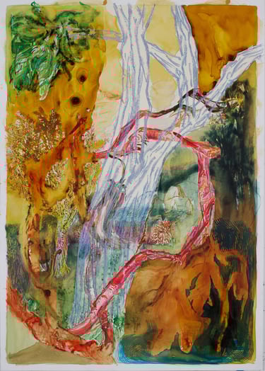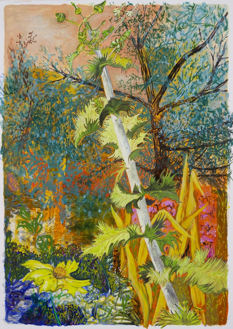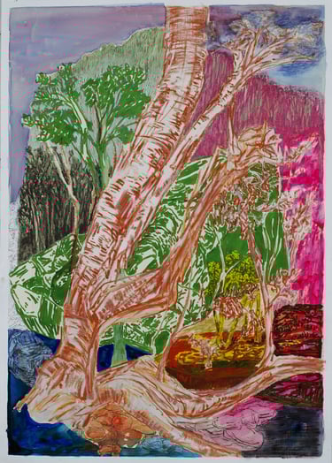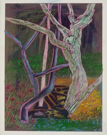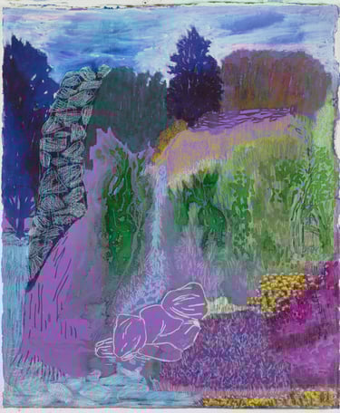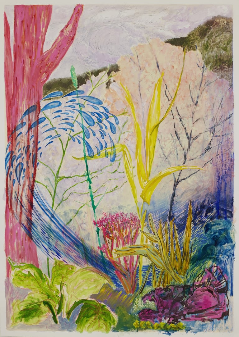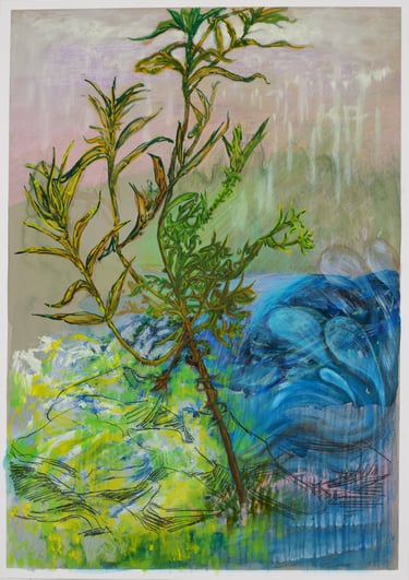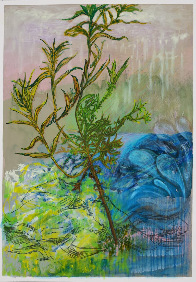 27 5/8"x19 5/8", watercolor, colored pencil, oil stick, oil pastel, on prepared paper, 2025