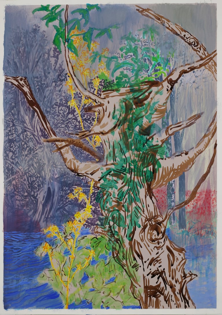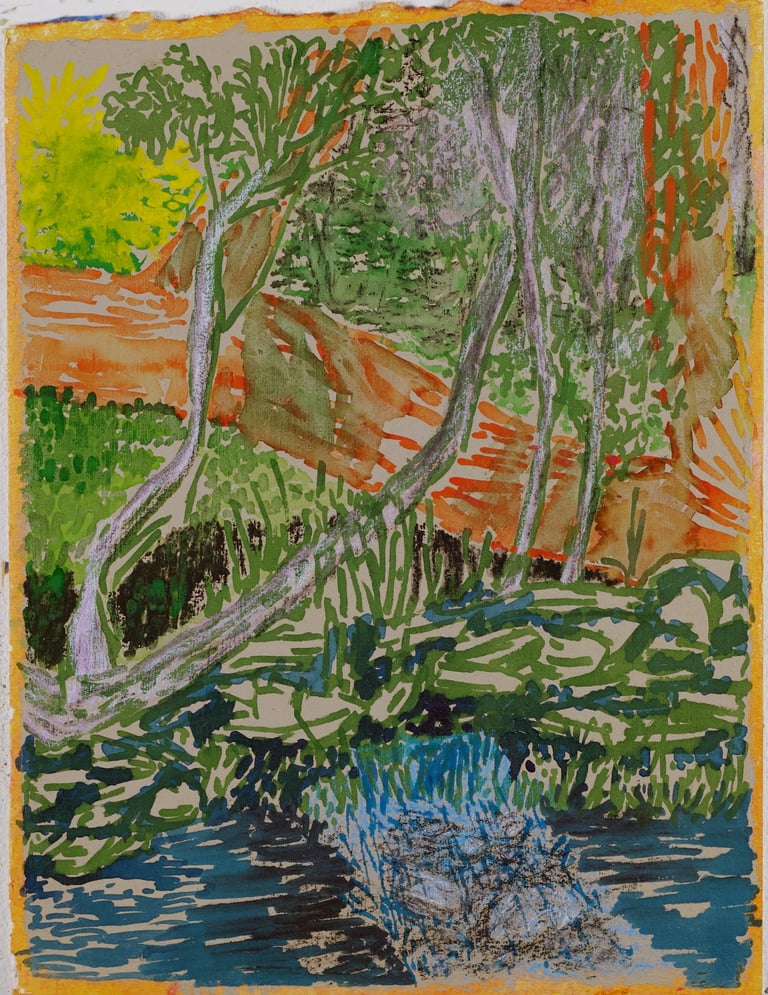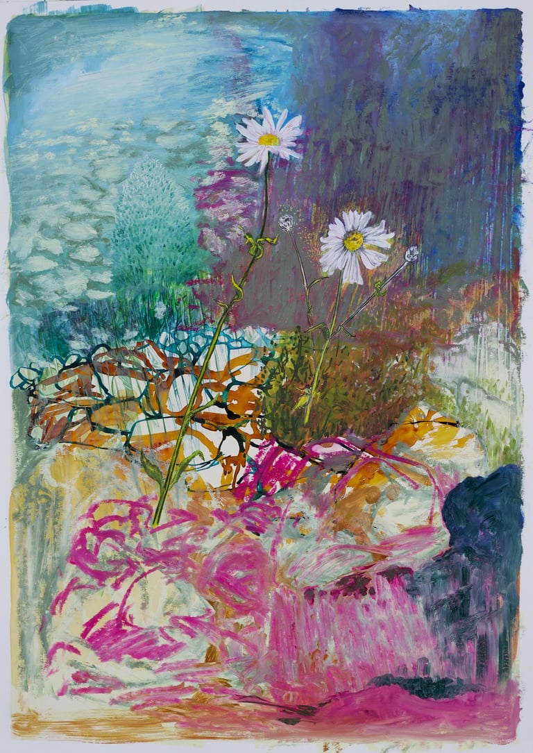 27 5/8"x19 5/8", watercolor, ink, colored pencil, oil stick, oil, on prepared paper, 2023