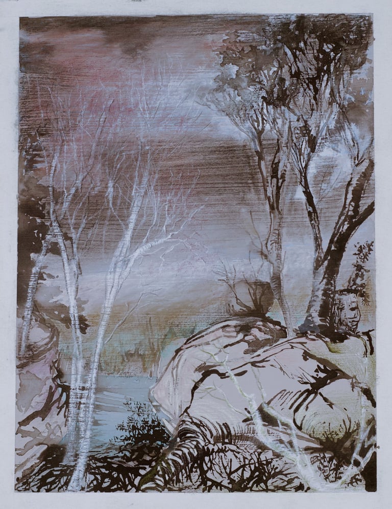 12 5/8"x9 3/4",ink, pastel pencil, watercolor, on prepared paper, 2022